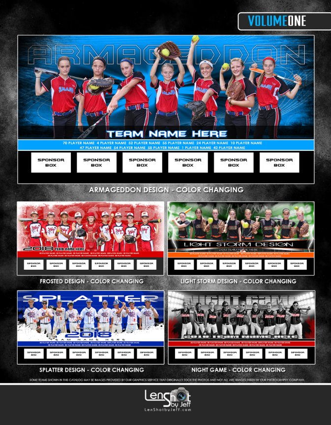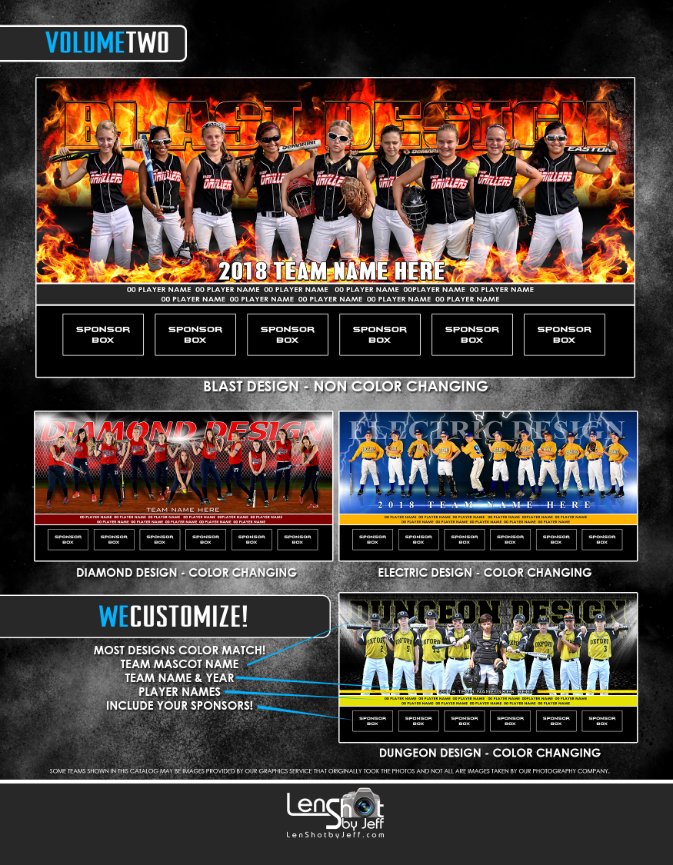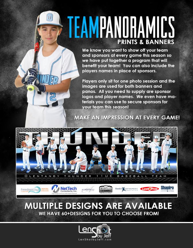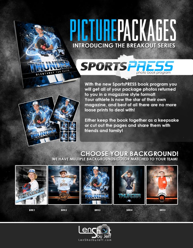 We are offering a new concept for our Travel and All Star teams – 8x24 framed team panoramic print, a catalog of 50+ designs to choose from, 5 backgrounds for individual photos and our SportsPress Photo Book program where your players is the star of their own magazine! Your league can sell ads in these books for fundraising, include league info about schedules, teams, etc. Whatever you provide we can put in this book.