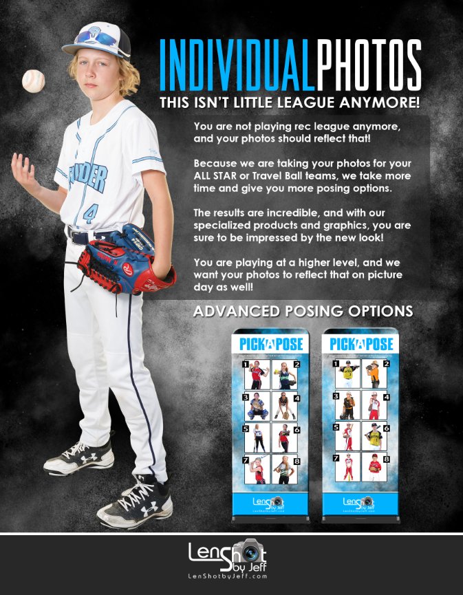 You are not playing rec league anymore, and your photos should reflect that! Because we are taking your photos for your ALL STAR or Travel Ball teams, we take more time and give you more posing options. The results are incredible, and with our specialized products and graphics, you are sure to be impressed by the new look! You are playing at a higher level, and we want your photos to reflect that on picture day as well!!!